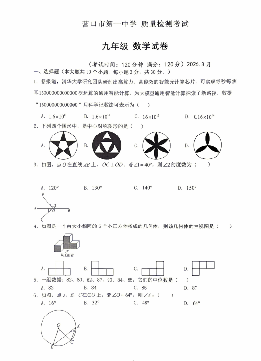 2026年辽宁省营口市第一中学+质量检测考试+九年级+数学试卷