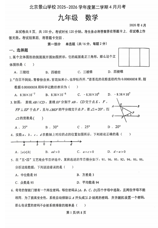 北京景山学校2025~2026学年度第二学期4月学情自测九年级+数学