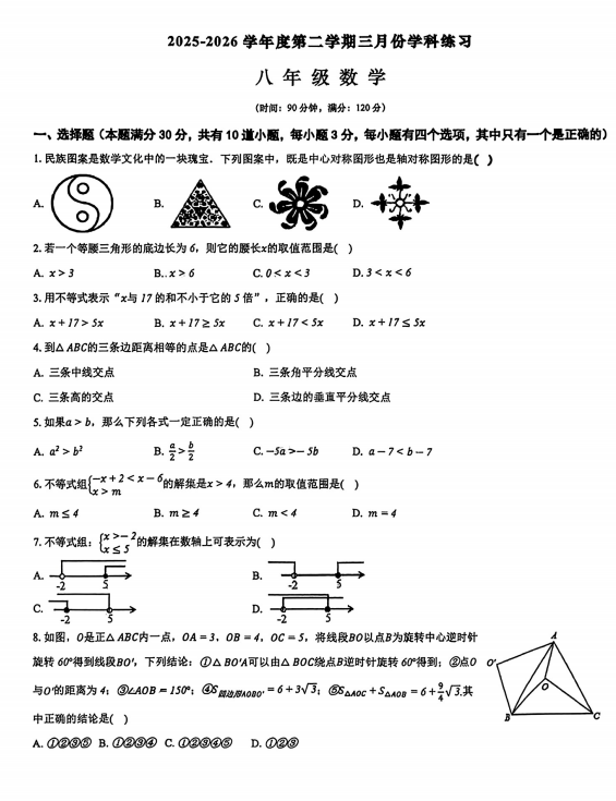 山东青岛志远学校2025-2026学年下学期八年级3月学情自测数学试题