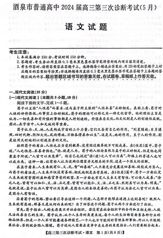 2024届甘肃省酒泉市高三三模语文试题