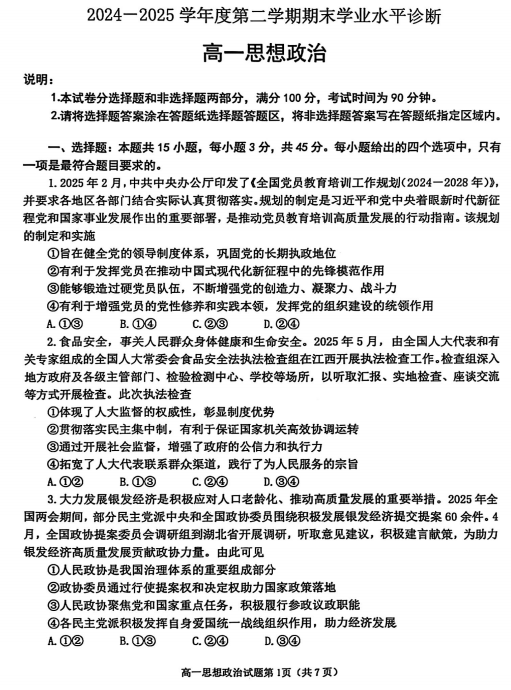 山东省烟台市2024-2025学年高一下学期期末考试政治试题