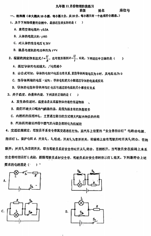 江苏省苏州市苏州工业园区星港学校2024-2025学年九年级上学期第一次月考物理试题