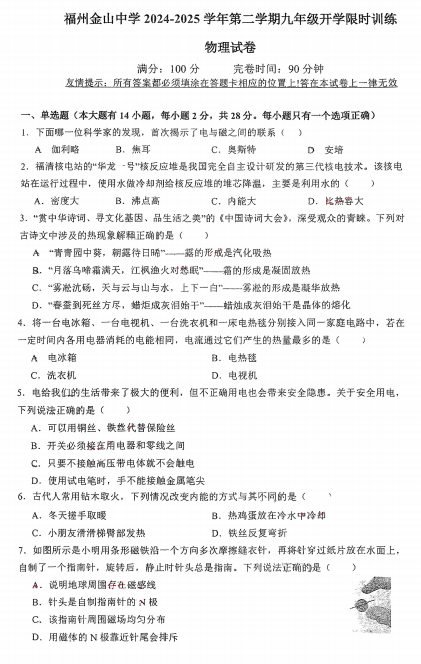 福建省福州金山中学2024-2025学年九年级下学期入学考试物理试卷