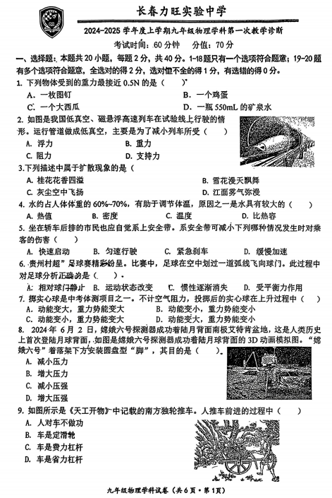 吉林省长春市力旺实验初级中学2024-2025学年上学期九年级第一次教学诊断物理试题