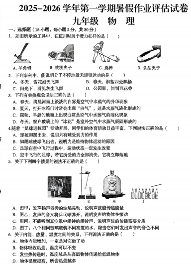 甘肃省武威市某校2025-2026学年九年级上学期暑假作业评估物理试卷