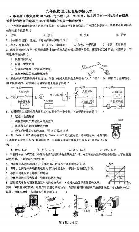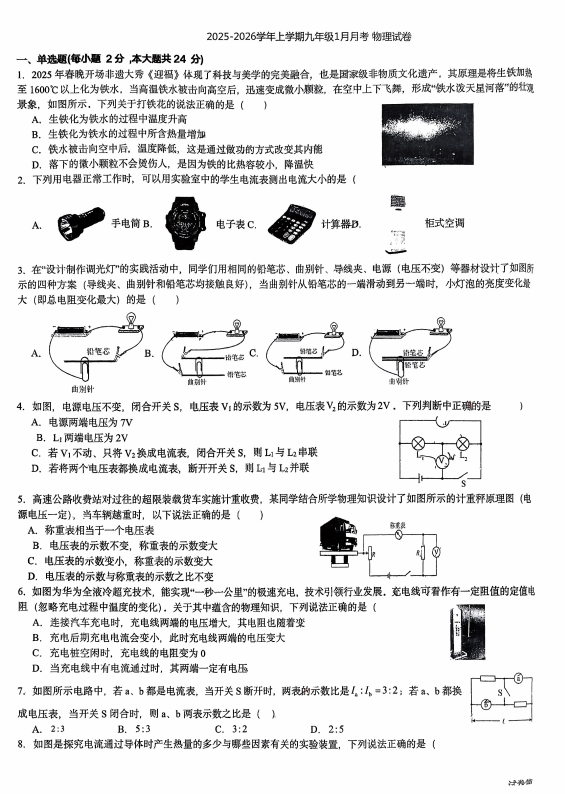 湖北省武汉市江岸区武汉江岸三校教联体2025-2026学年九年级上学期1月月考物理试题