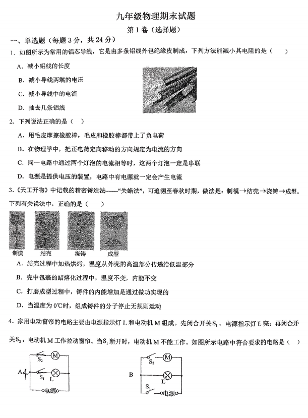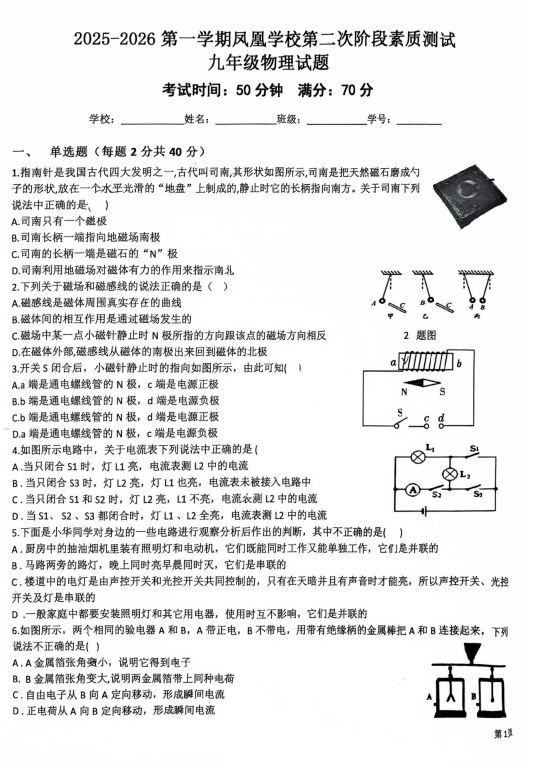 山东省菏泽市鄄城县凤凰镇凤凰学校2025-2026学年九年级上学期1月月考物理试题
