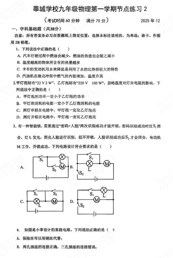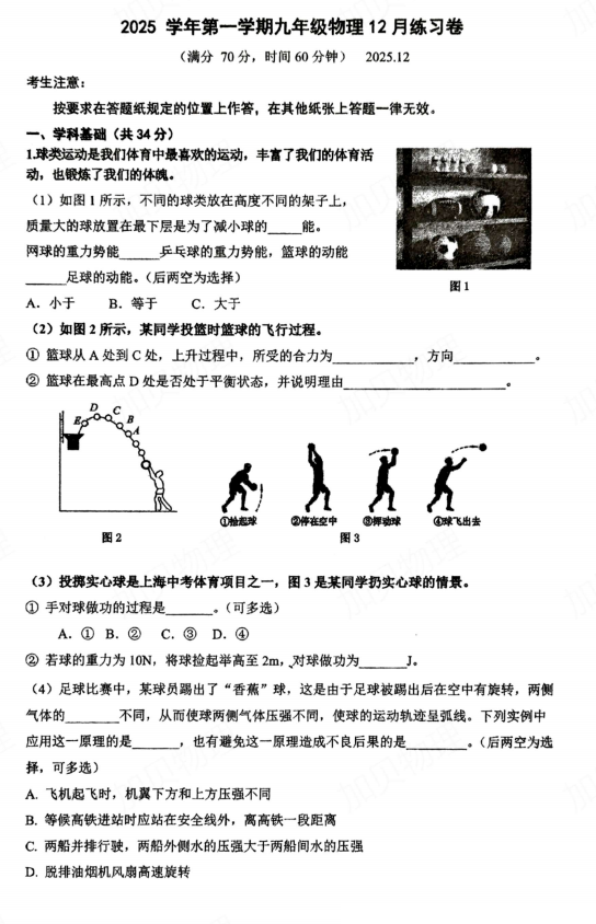 2025年上海市闵行区莘城学校九年级物理上学期12月节点练(1)