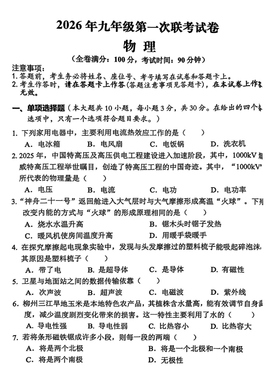 2026年广西柳州市鱼峰区中考一模物理试题