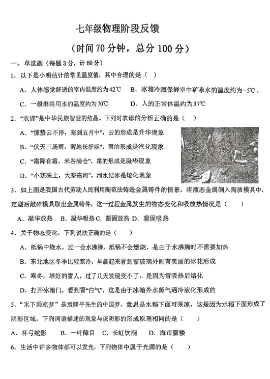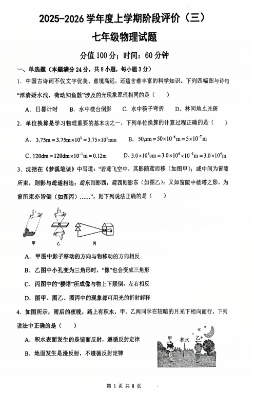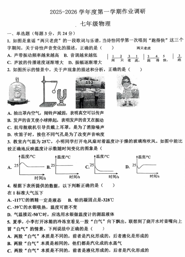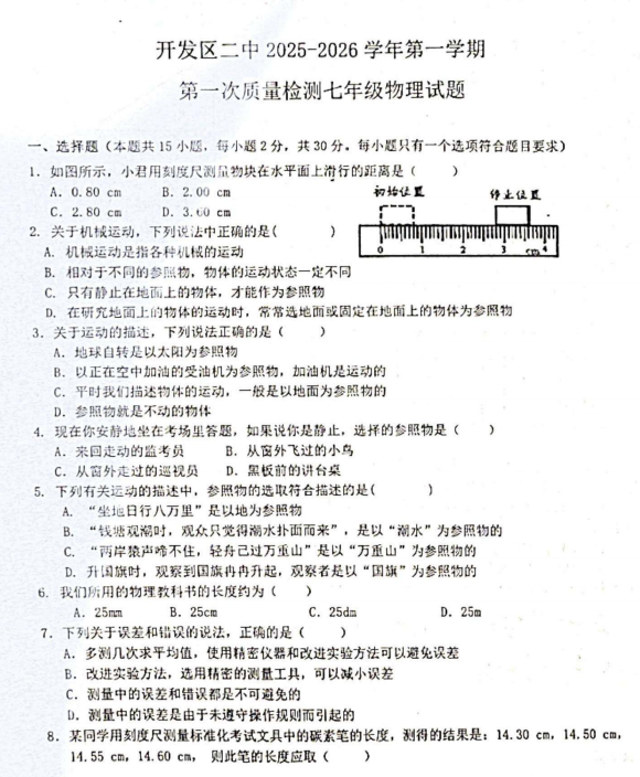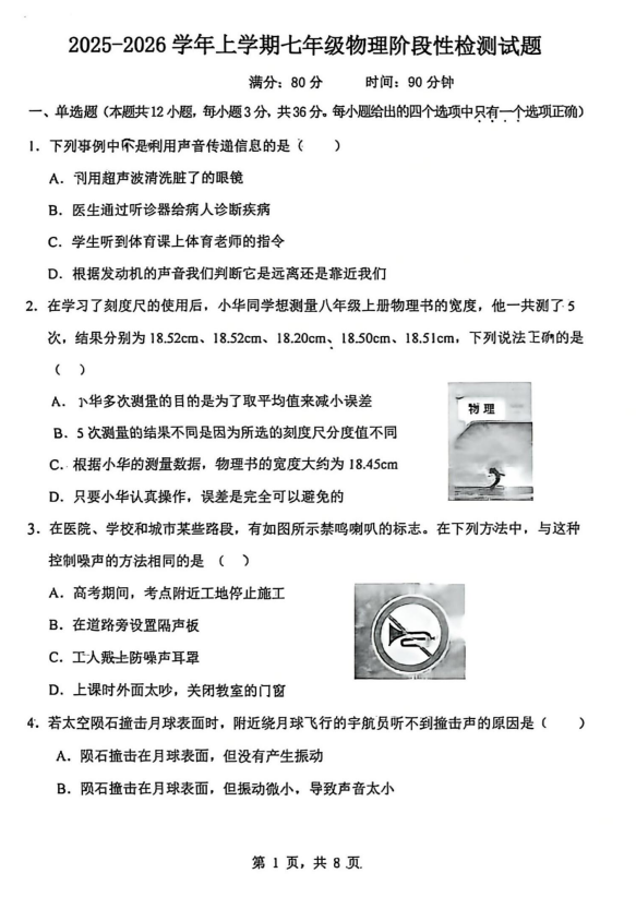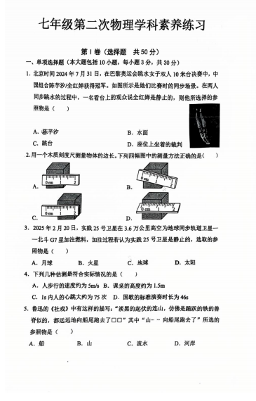 山东省德州市第五中学2025-2026学年七年级上学期第二次阶段性检测物理试题(1)