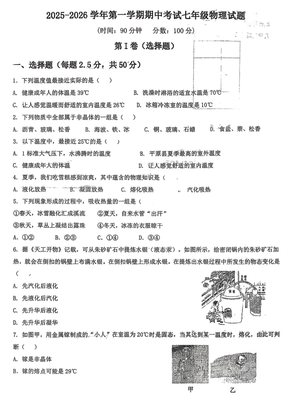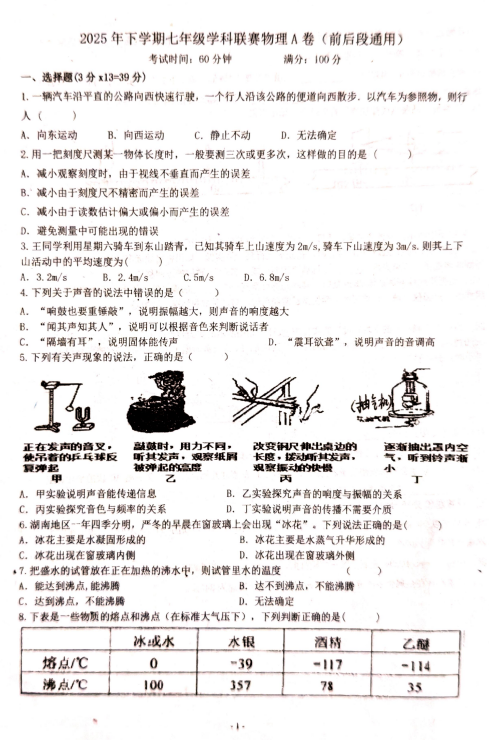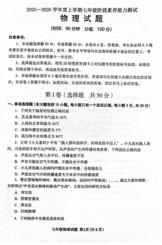 山东省德州市平原县平原龙门中学、平原二中、平原汇文中学等2025-2026学年七年级上学期1月月考物理试题