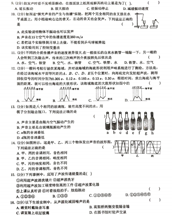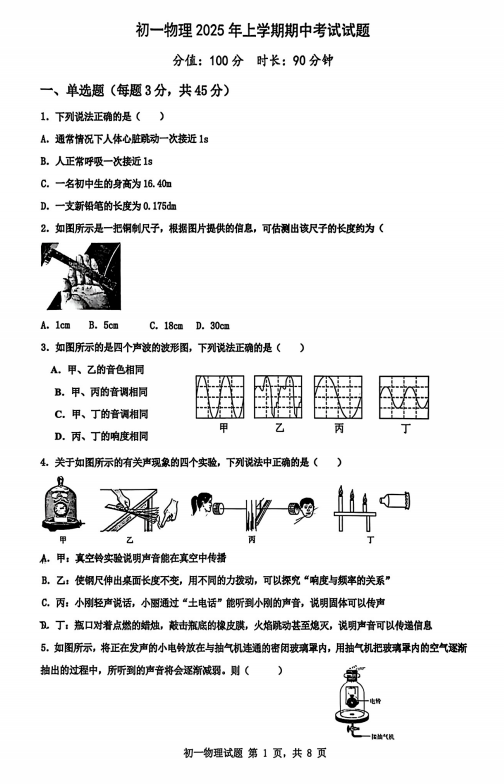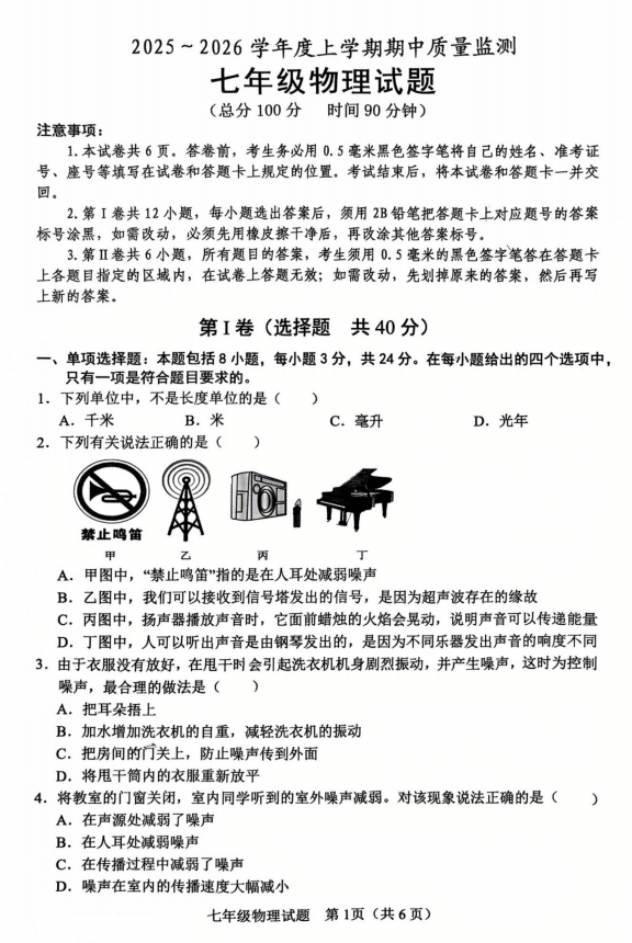 山东省滨州市中海中学2025-2026学年七年级上学期期中考试物理试卷