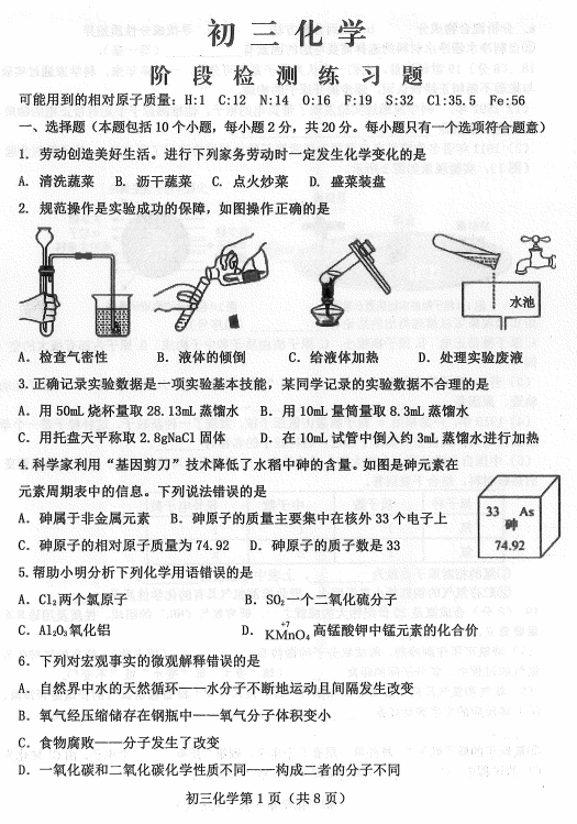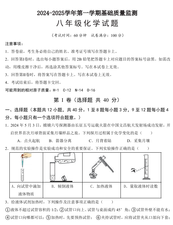 山东省东营市东营区等3地2024-2025学年八年级上学期1月期末考试化学试题