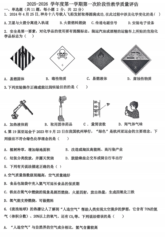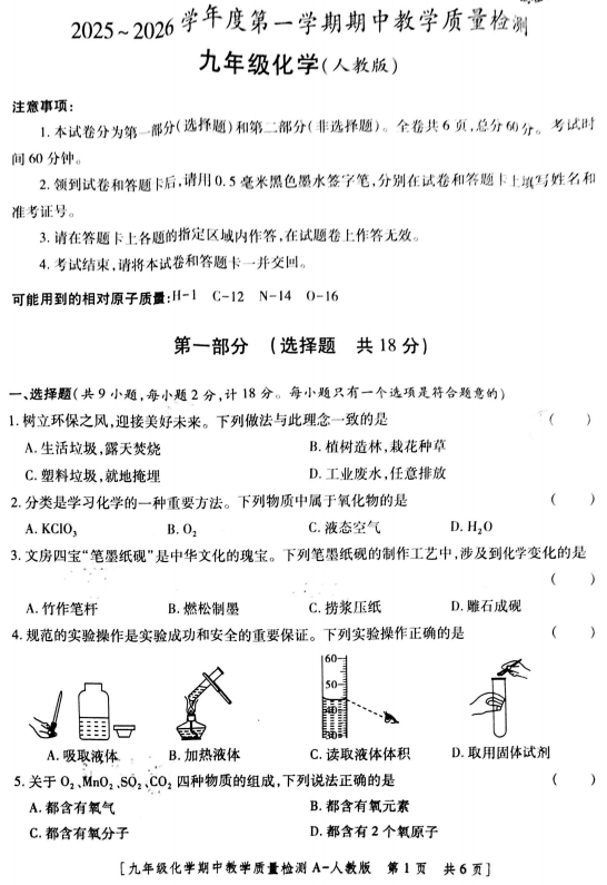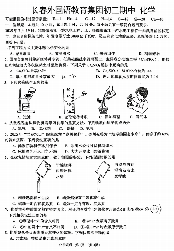 吉林省长春市外国语学校教育集团2025-2026学年九年级上学期期中考试化学试卷