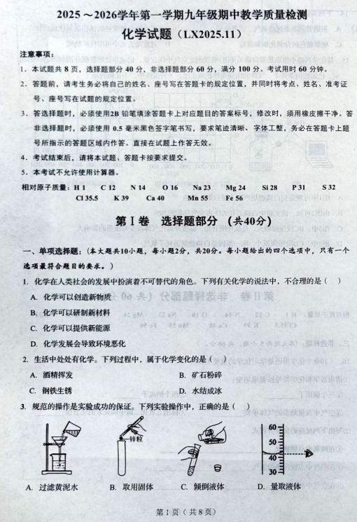 山东省济南市历下区2025-2026学年九年级上学期期中考试化学试题