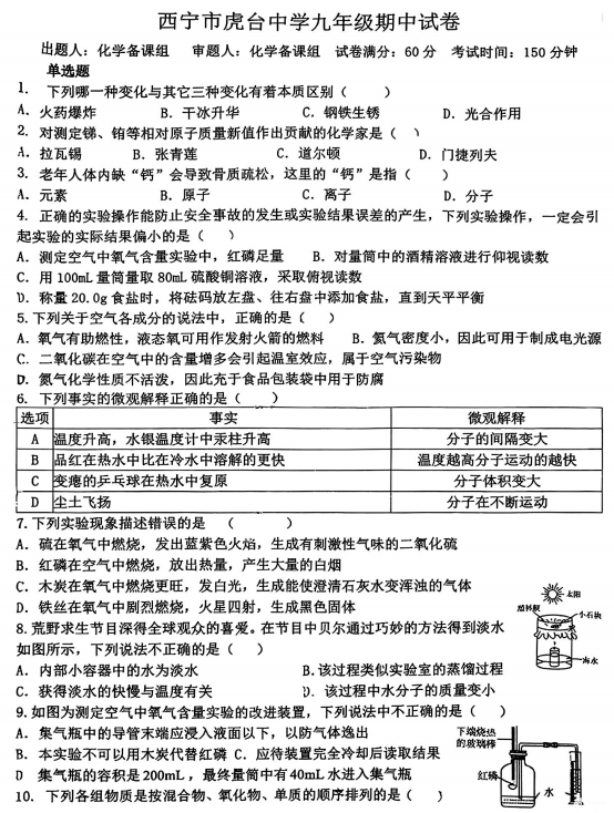 内蒙古包头市第五中学2025-2026学年九年级上学期第一次月考化学试卷