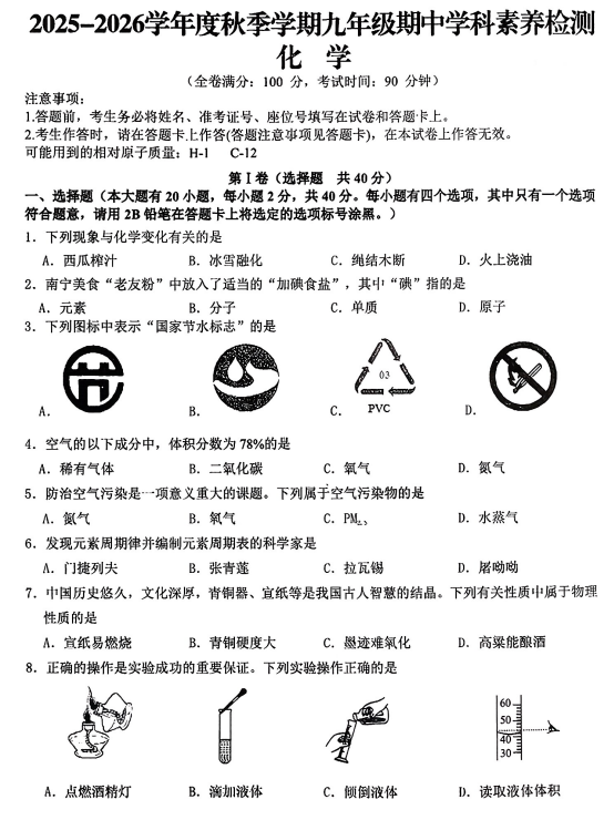 广西南宁市第十四中学2025-2026学年九年级上学期期中检测化学试卷