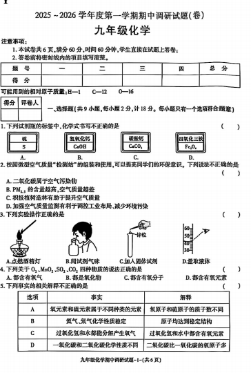陕西省咸阳市2025-2026学年九年级上学期11月期中考试化学试题