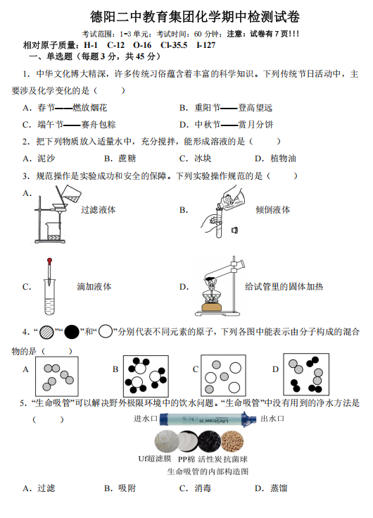 四川省德阳市第二中学校2025-2026学年九年级上学期期中考试化学试题
