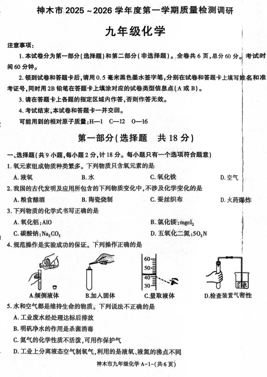 陕西省榆林市神木市2025-2026学年九年级上学期11月期中化学试题