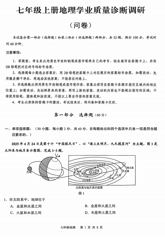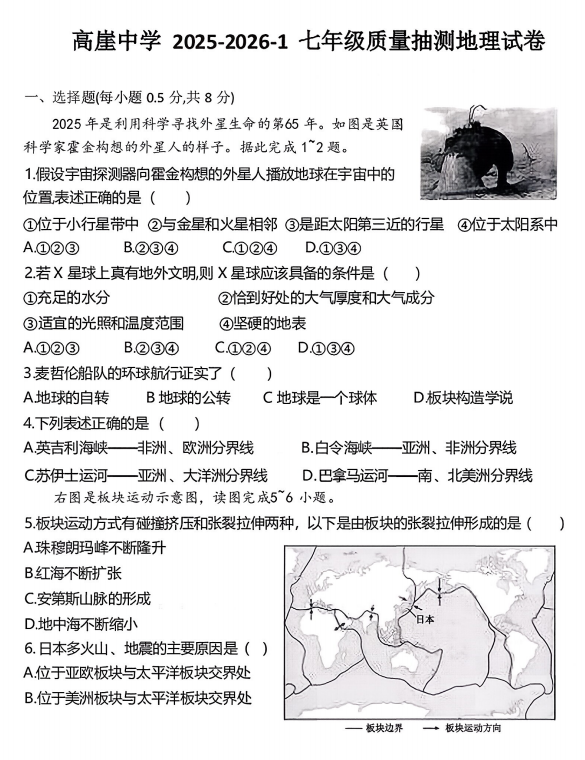宁夏海原县高崖乡九年一贯制学校2025-2026学年七年级上学期期末检测地理试卷