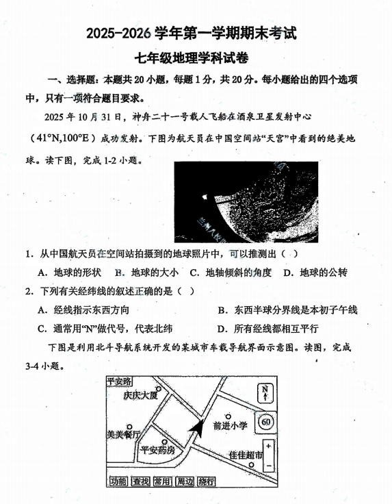 吉林省长春市朝阳区2025-2026学年七年级上学期期末地理试题