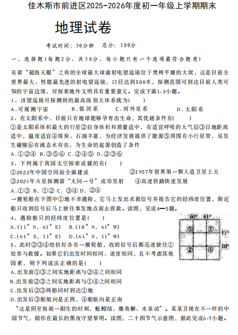 黑龙江省佳木斯市前进区2025-2026学年七年级上学期期末地理试题