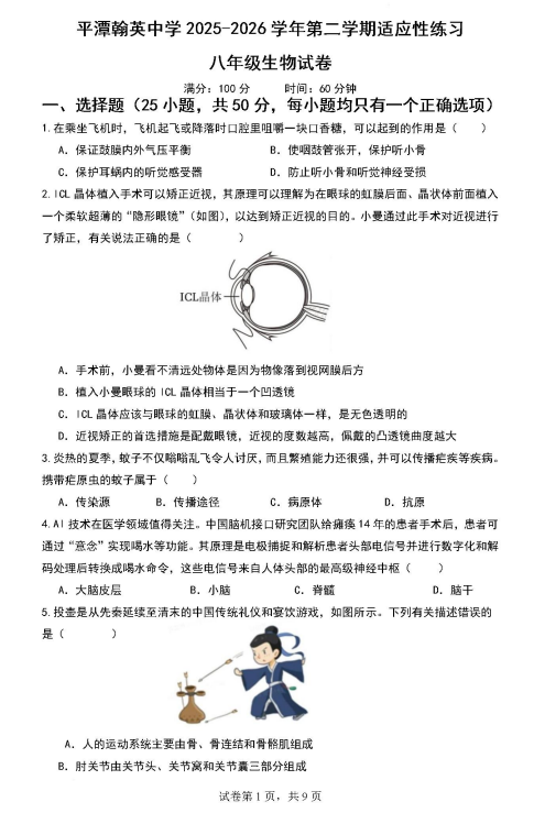 福建省福州市平潭县平潭翰英中学2025-2026学年八年级上学期12月月考生物试题