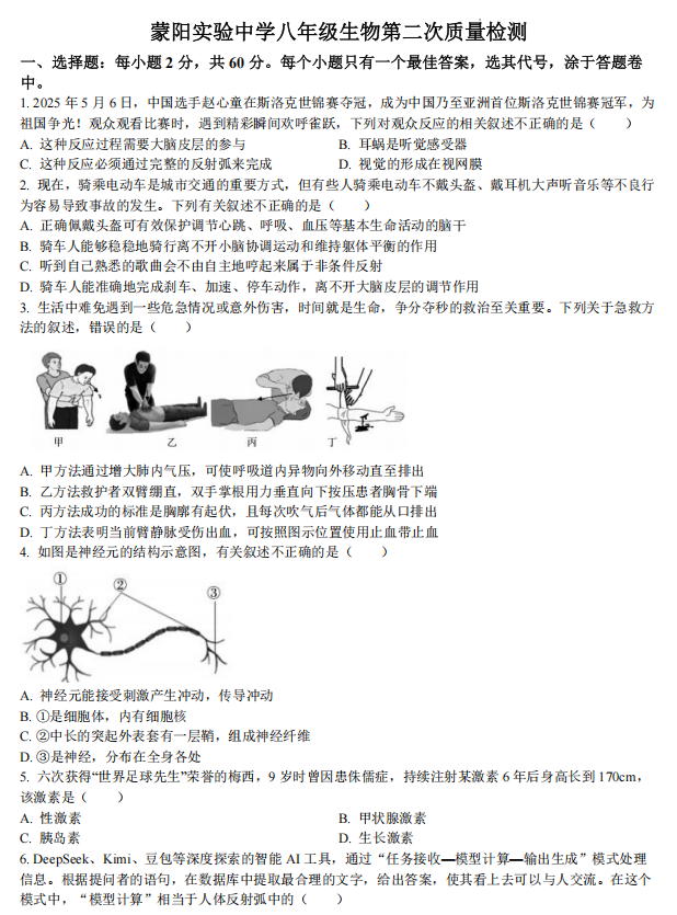 山东省临沂市平邑县蒙阳实验初级中学2025-2026学年八年级上学期1月月考生物试题