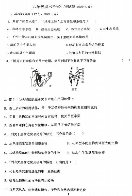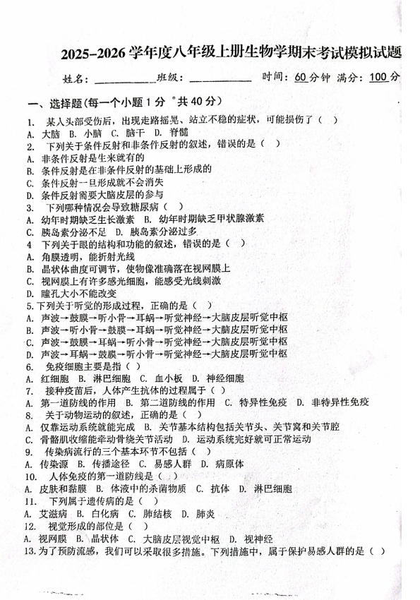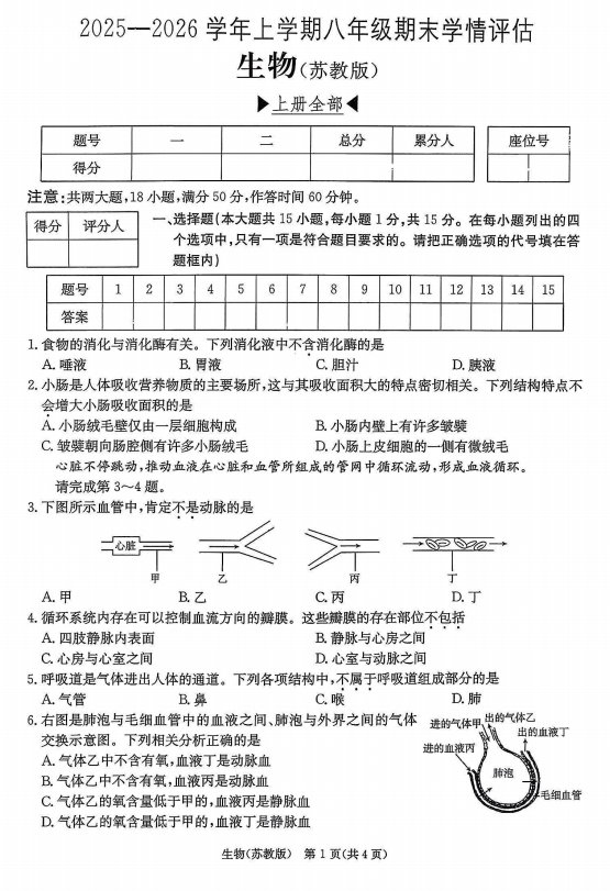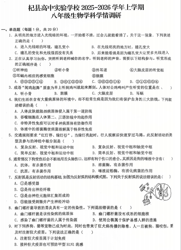 河南省杞县高中实验学校2025-2026学年八年级上学期生物学1月科学情调研试题