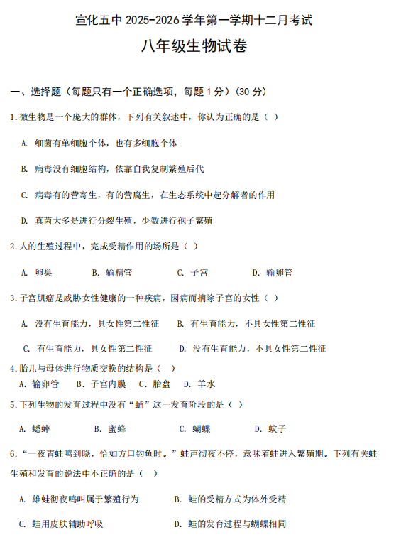 河北省张家口市宣化区第五中学2025-2026学年八年级上学期12月月考生物试卷