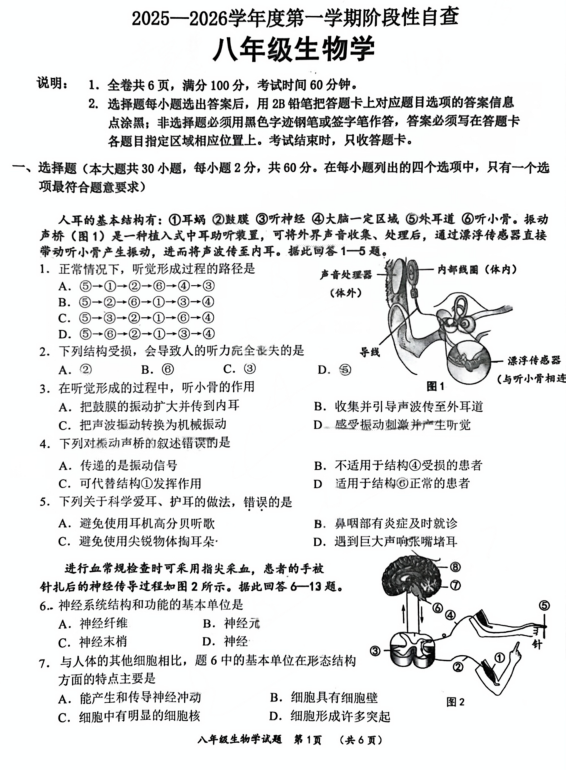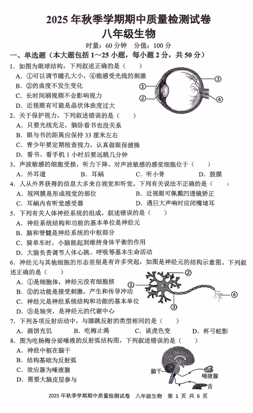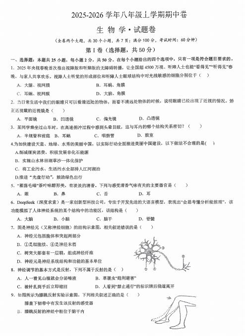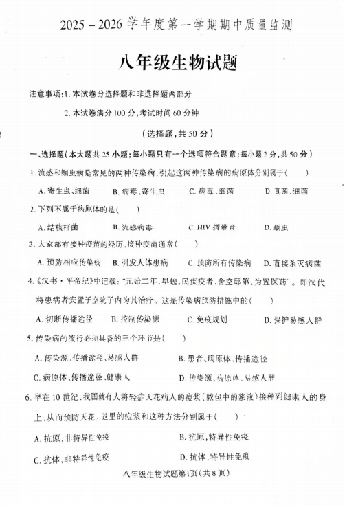 河北省保定市定州市2025-2026学年八年级上学期11月期中考试生物试题
