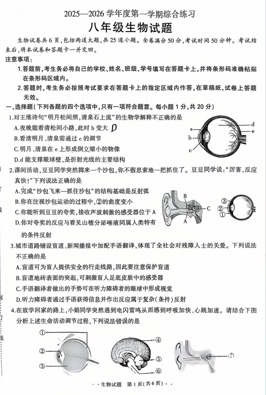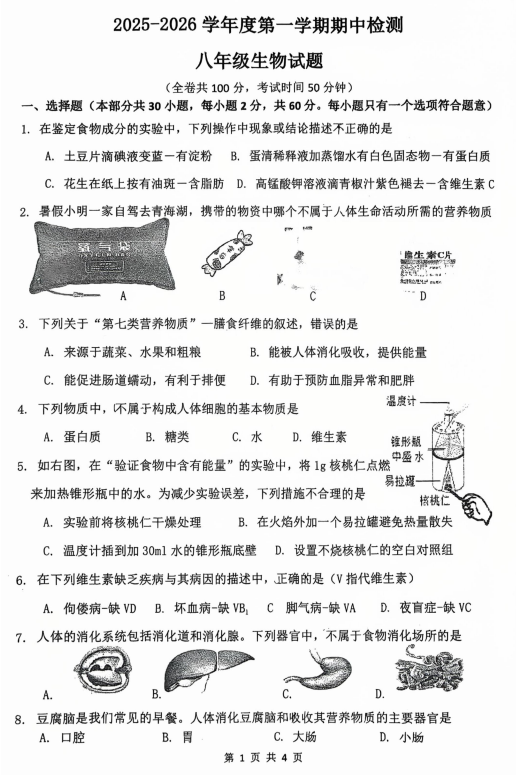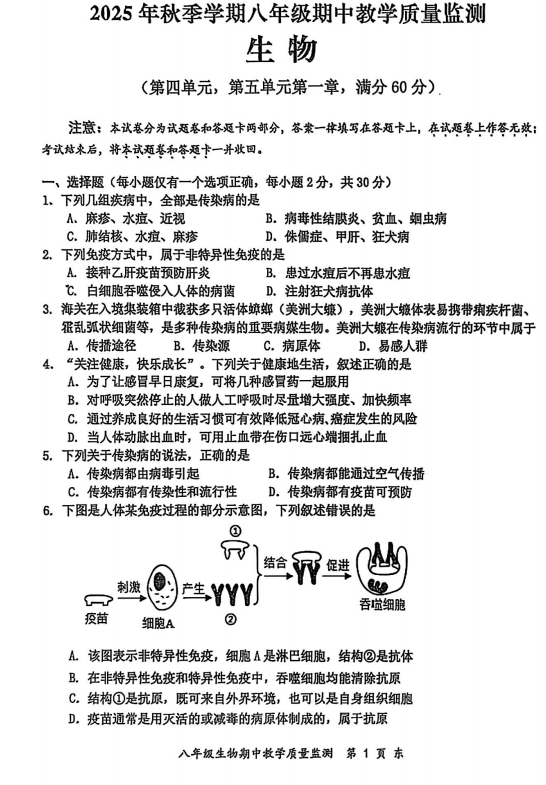 河南省淮阳第一中学2025-2026学年八年级上学期期中生物试题