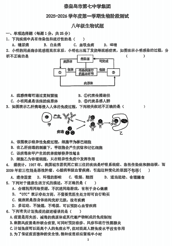 河北省秦皇岛市第七中学集团2025-2026学年八年级上学期期中考试生物试题