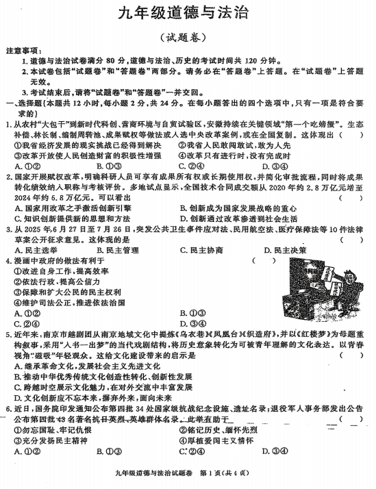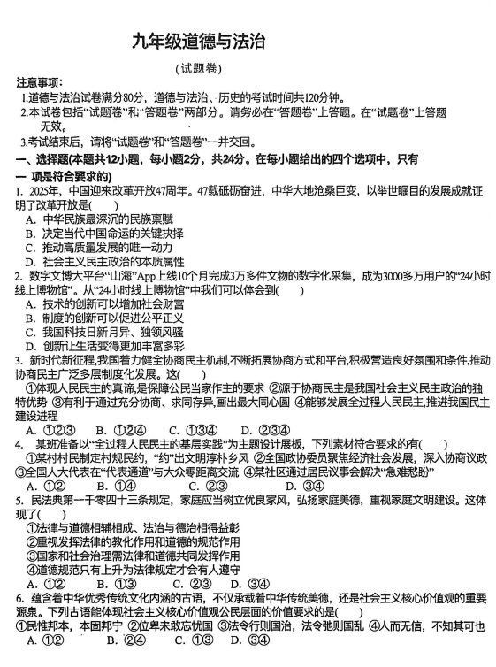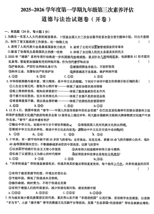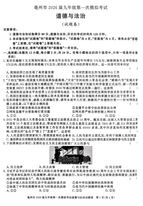 安徽省亳州市利辛县2025-2026学年九年级上学期12月期末(一模)道德与法治试题