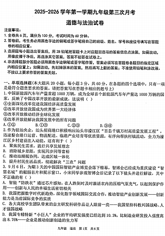 广东省汕头市潮阳区金培学校+2025-2026学年九年级上学期第三次月考道德与法治试卷