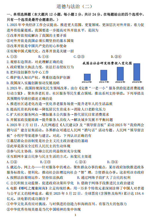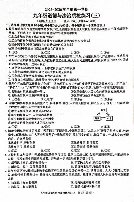 安徽省六安市轻工中学2025-2026学年九年级上学期12月月考道德与法治试题