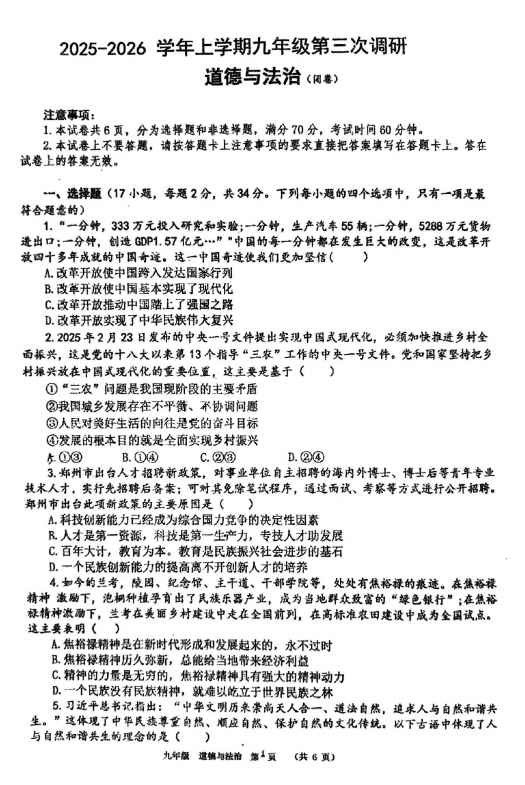 安徽省阜阳市界首市第五中学2025-2026学年九年级上学期第三次月考道德与法治试题