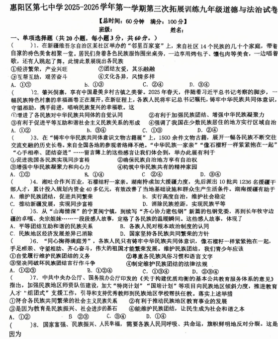 广东省惠州市惠阳区第七中学2025-2026学年九年级上学期12月月考道德与法治试题