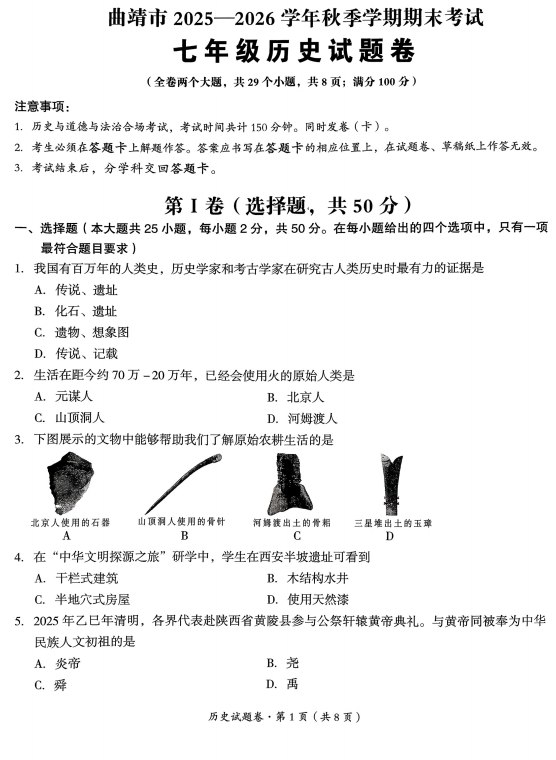 云南省曲靖市2025-2026学年七年级上学期1月期末历史试题