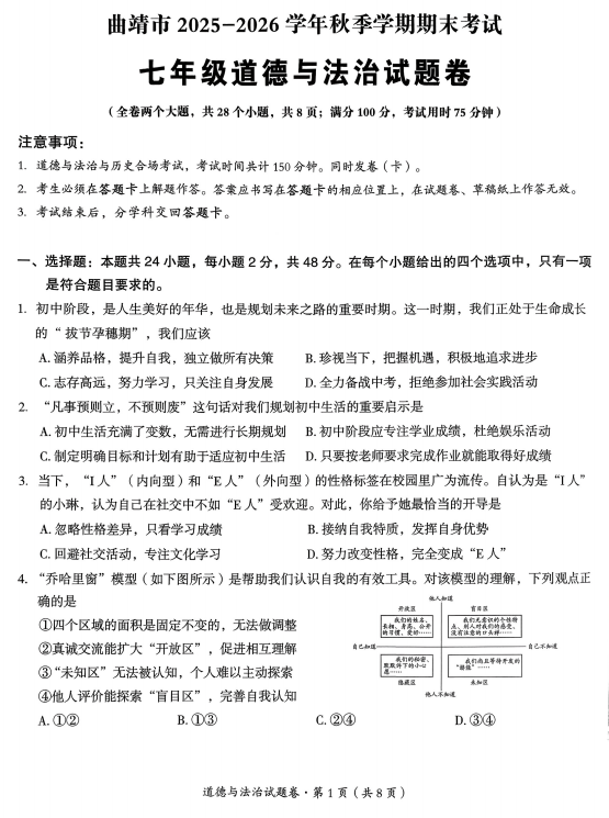 云南省曲靖市2025-2026学年七年级上学期1月期末道德与法治试题