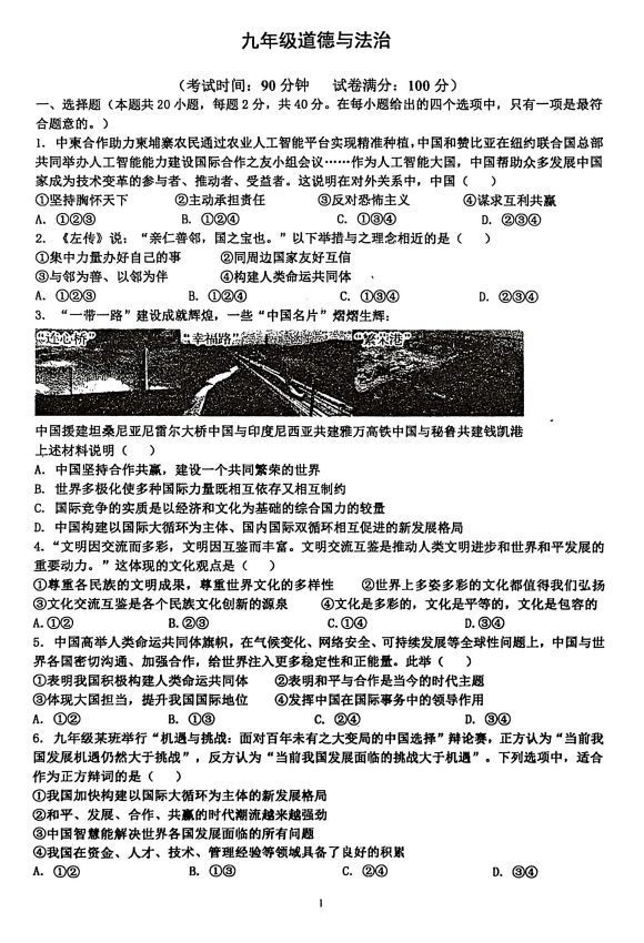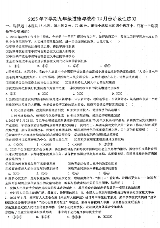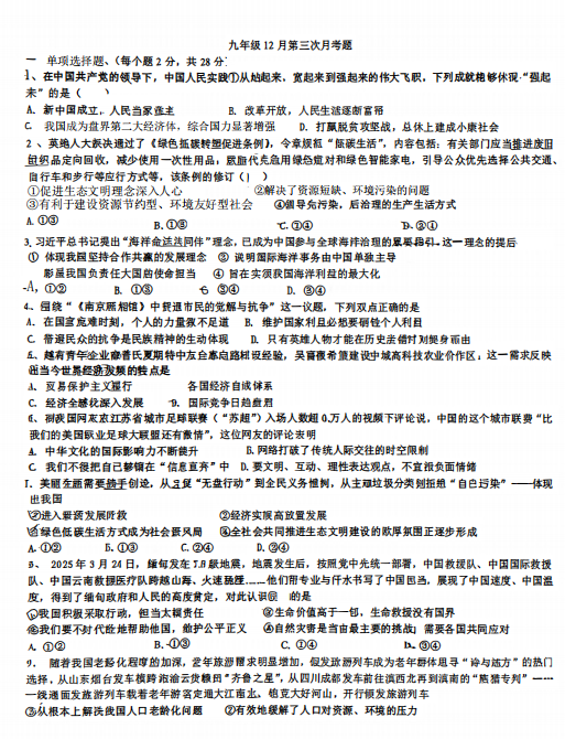 天津市西青区张家窝中学2025-2026学年九年级上学期12月月考道德与法治试题