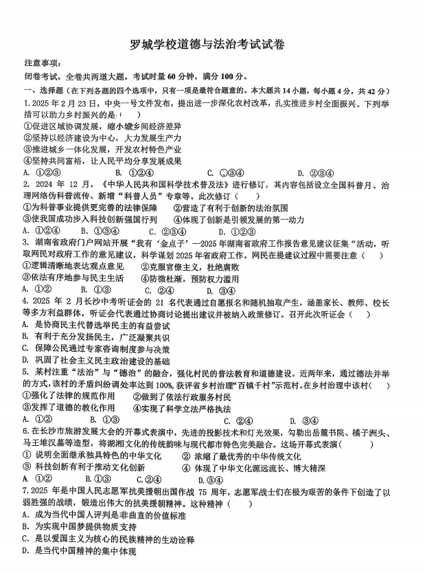 湖南省岳阳市汨罗市罗城学校2025-2026学年九年级上学期12月月考道德与法治试题