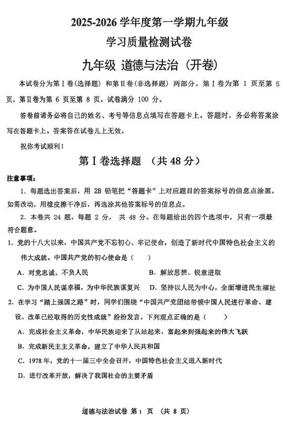 山东省菏泽市东明县三校联考2025-2026学年九年级上学期12月月考道德与法治试题