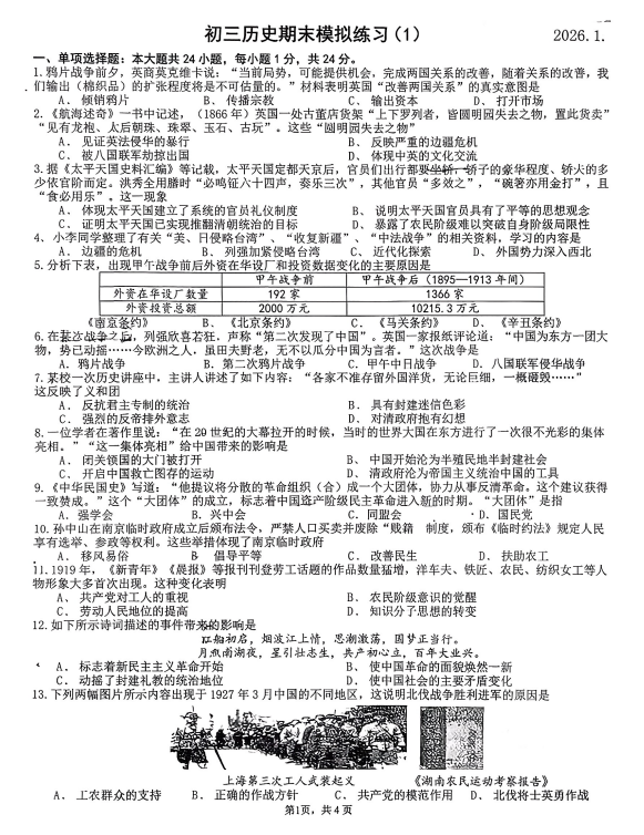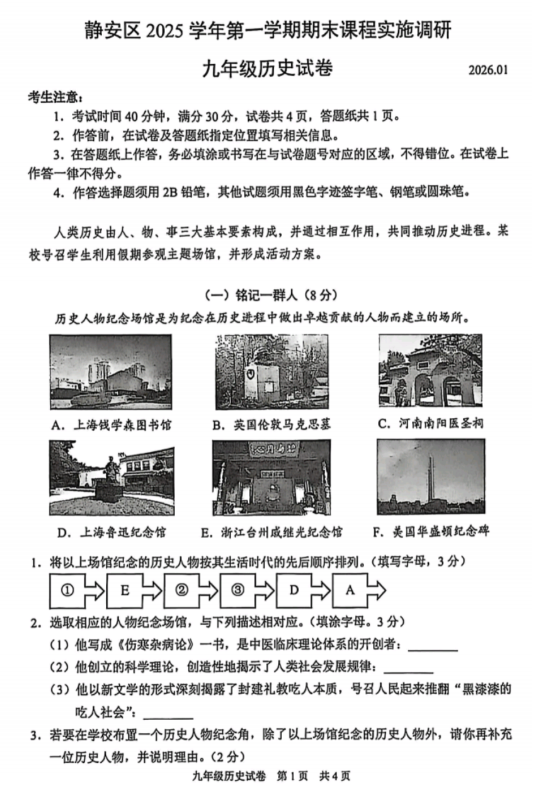 上海市静安区2025-2026学年九年级上学期1月期末历史试题