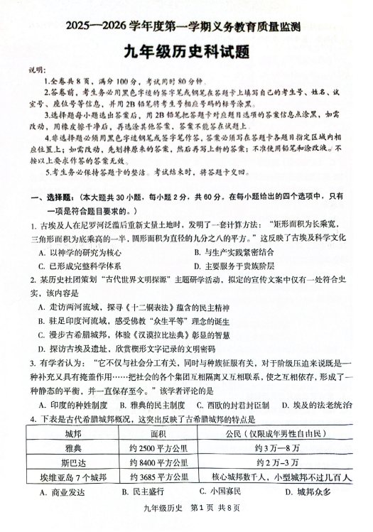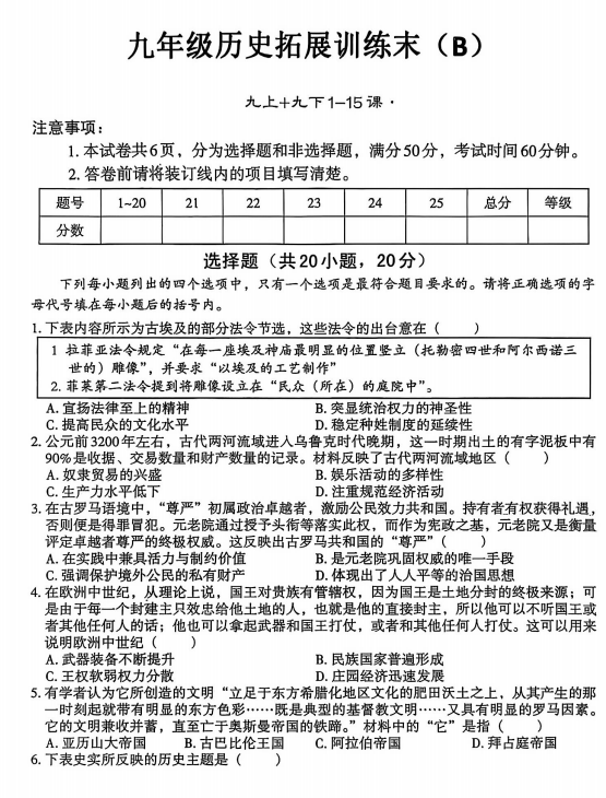 河南省部分地区2025-2026学年上学期九年级历史期末B试卷