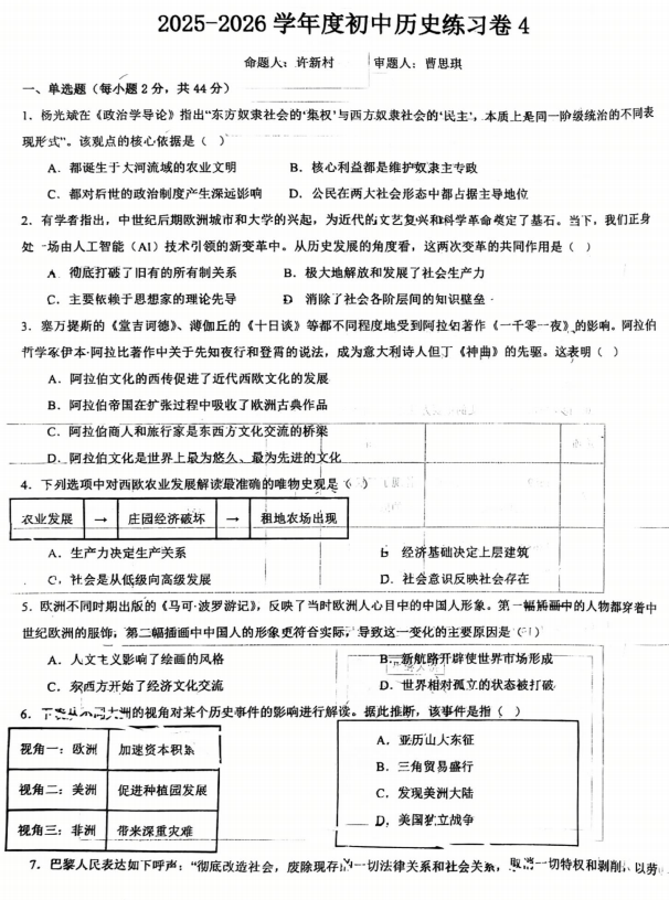 江西省九江市柴桑区第四中学2025-2026学年九年级上学期历史第三次月考试题