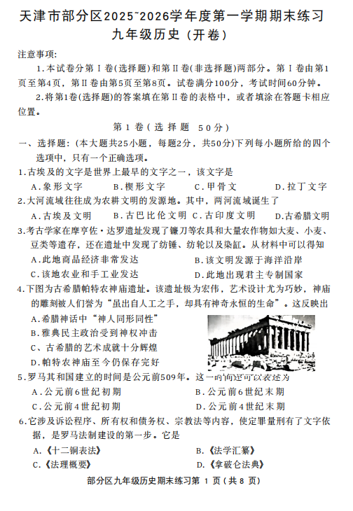 天津市部分区2025-2026学年上学期期末练习九年级历史试题