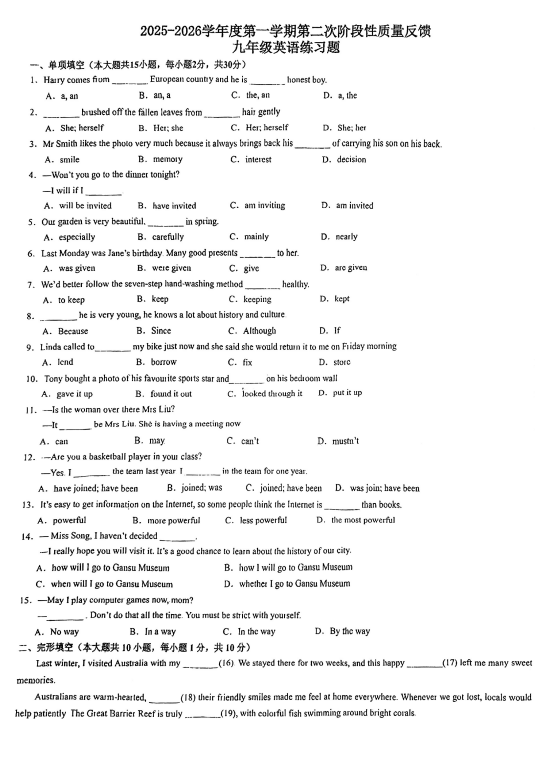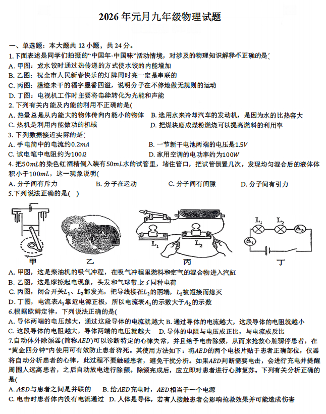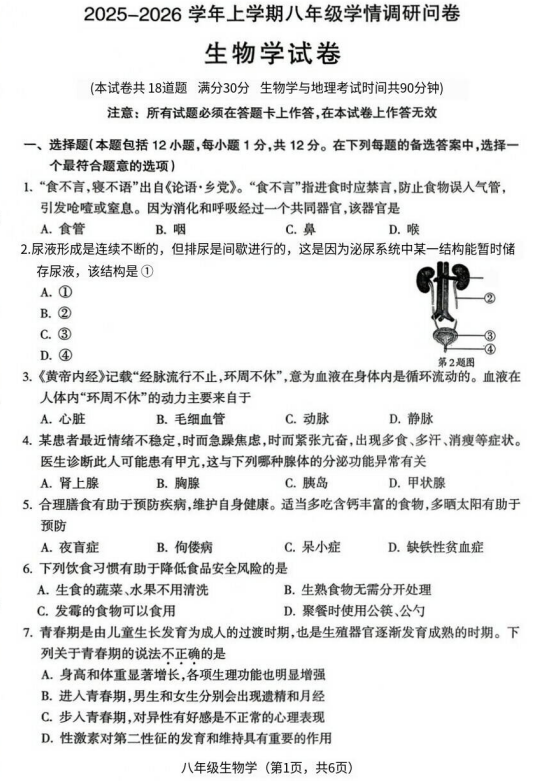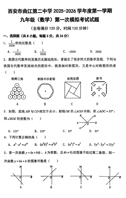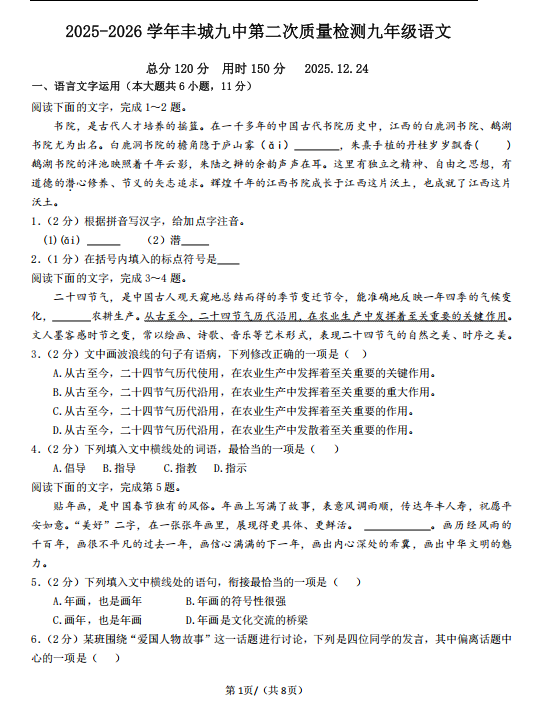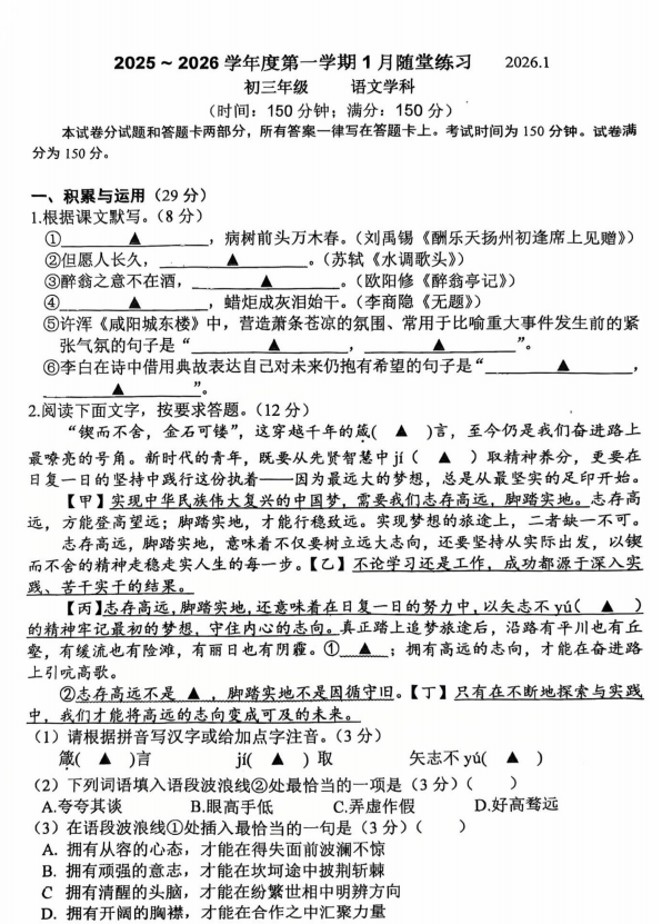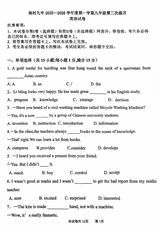 江苏省扬州市江都区第二中学2025-2026学年九年级上学期12月月考历史试题