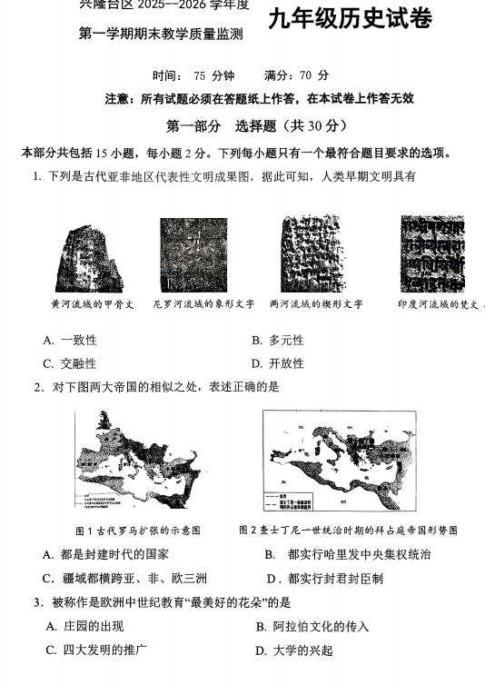 山东省德州市平原县龙门中学、平原二中、平原汇文中学等2025-2026学年九年级上学期1月月考历史试题